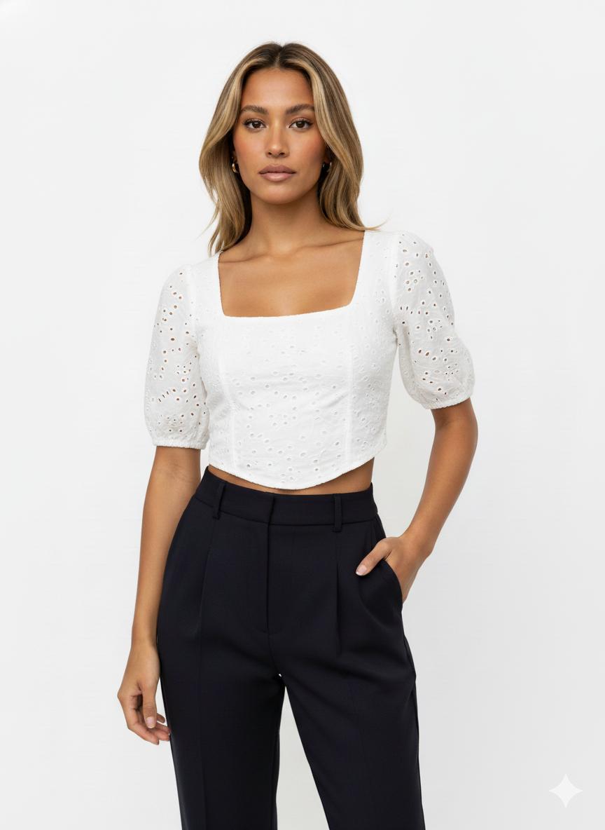 Top blanco broderie manga corta – Cuello cuadrado
