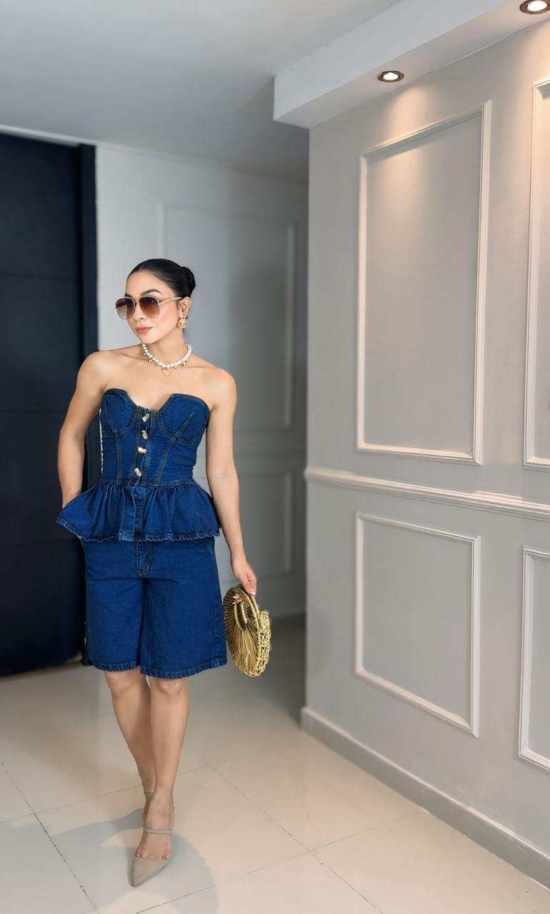 Set en denim de dos piezas con silueta definida y diseño moderno